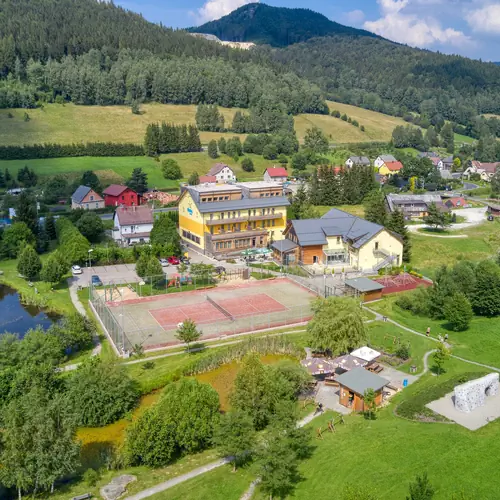 - rozsáhlá hotelová zahrada, kde se nachází velké víceúčelové hřiště s umělým povrchem a večerním osvětlením, Discgolfové hřiště, 2 rybníky, dětská lezecká stěna, lanová dvojpyramida, trampolínua a samozřejmostí jsou dětská hřiště, půjčovna kol, elektrokol,…